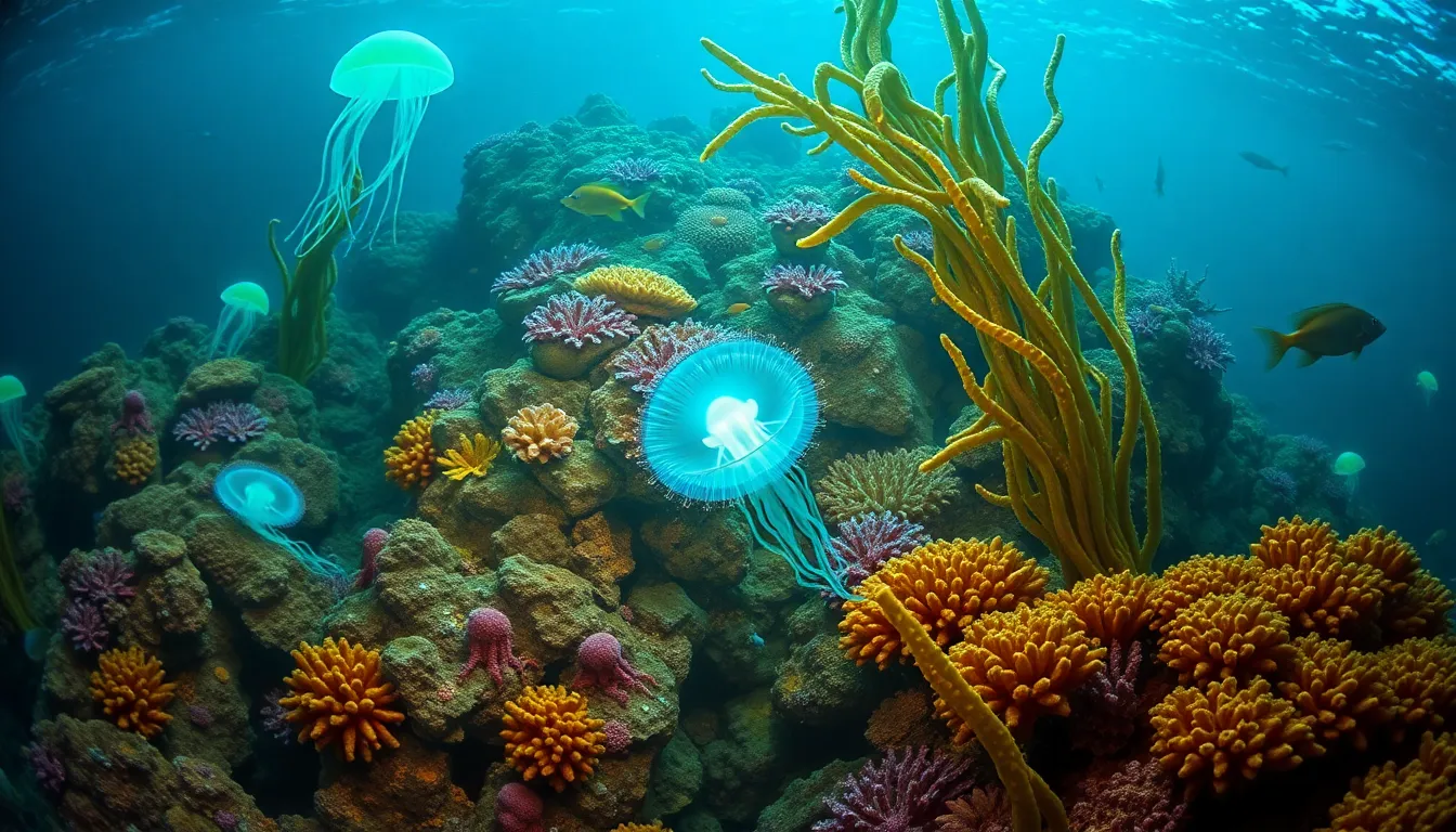 Coral reefs serve as a habitat for diverse marine life. Various fish species, like parrotfish and cleaner wrasses, maintain the health of these reefs. Nudibranchs, with their colorful bodies, feed on algae and sponges, which contributes to reef balance. Kelp forests provide shelter for creatures like sea otters and various fish. They also influence currents and nutrient flow within the ecosystem, promoting rich biodiversity. Nutrient cycling occurs as plants photosynthesize, supporting herbivores and predators alike. These interactions create a delicate web, ensuring survival for many species.